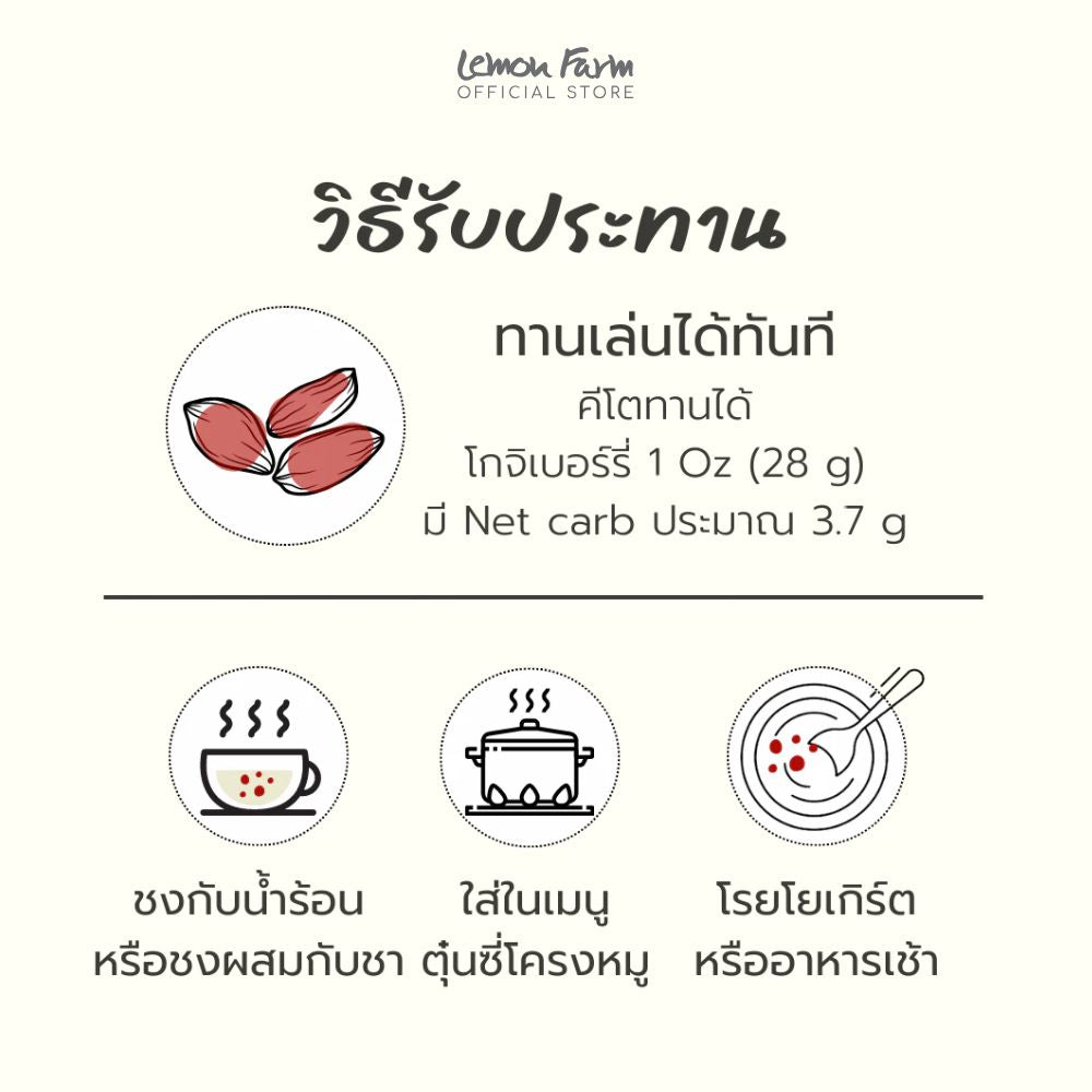 ทานเล่นได้ทันที ต้มน้ำร้อนดื่มก่อนอาหารมื้อเช้า ชงผสมกับชา โรยบนโยเกิร์ต มีวิตามิน A ช่วยบำรุงสายตา และสารต้านอนุมูลอิสระ เป็นประโยชน์ต่อร่างกาย